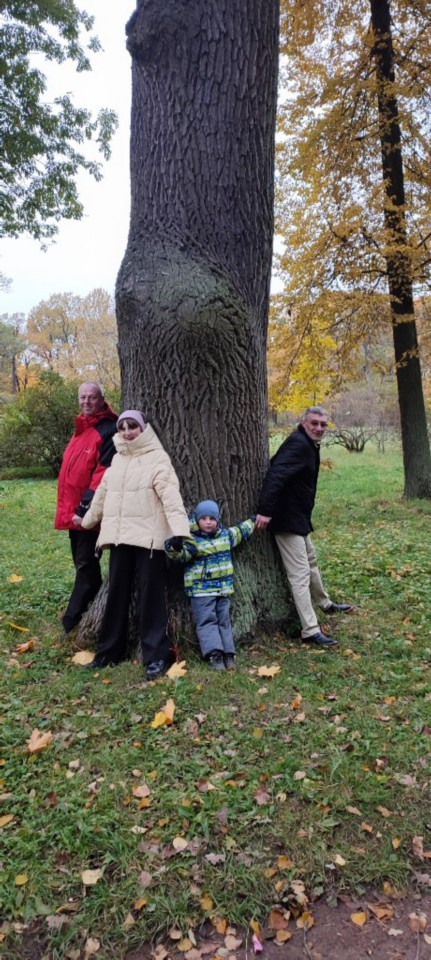 Осенью в выходные мы ездим гулять в разные парки. В этот раз были в Царском селе. Увидели огромный дуб. Нам стало интересно как его можно измерить... Решили мерить "в человеках" я знаю, что такого слова нет, но звучит весело)))... Этот дуб размером 5 людей ))) : мой папа+сестра+я+крёстный+мама (она за деревом) )))