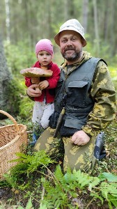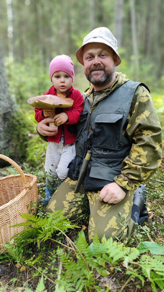 У нашего папы много разных увлечений, это подводная охота, стрельба из лука, всего не перечесть, но есть одно, которое разделяет вся наша семья – так называемая «тихая охота», это очень увлекательное занятие. Мы очень любим собирать грибы и, конечно, же их есть. Наташа ходит с нами в лес за грибами с 2-х лет. Наши друзья даже подарили нам карманный справочник грибника. Если бы наш папа участвовал в конкурсе грибников, то он, несомненно, занял бы первое место. Найти гриб не так просто, как кажется, это целый квест, но находке радуются и взрослые, и дети. Например, большой боровик на фото папа нашел в зарослях папоротника, обычно там не бывает грибов. И он оказался не старым и совсем не червивым, а каким вкусным! А какое удовольствие бродить по осеннему лесу, вдыхать аромат хвои, слушать шорох листьев под ногами и щебетанье птиц. И вдруг полянка, устланная ковром из мха, прям как в сказке, а вон там стоит у всех на виду мухомор в своей ярко-красочной и глянцевой шляпке в белую крапинку, поневоле остановишься и залюбуешься. Но Наташа уже знает, что есть грибы съедобные и несъедобные и что мухоморы собирать нельзя. А вы открыли сезон «тихой охоты»?