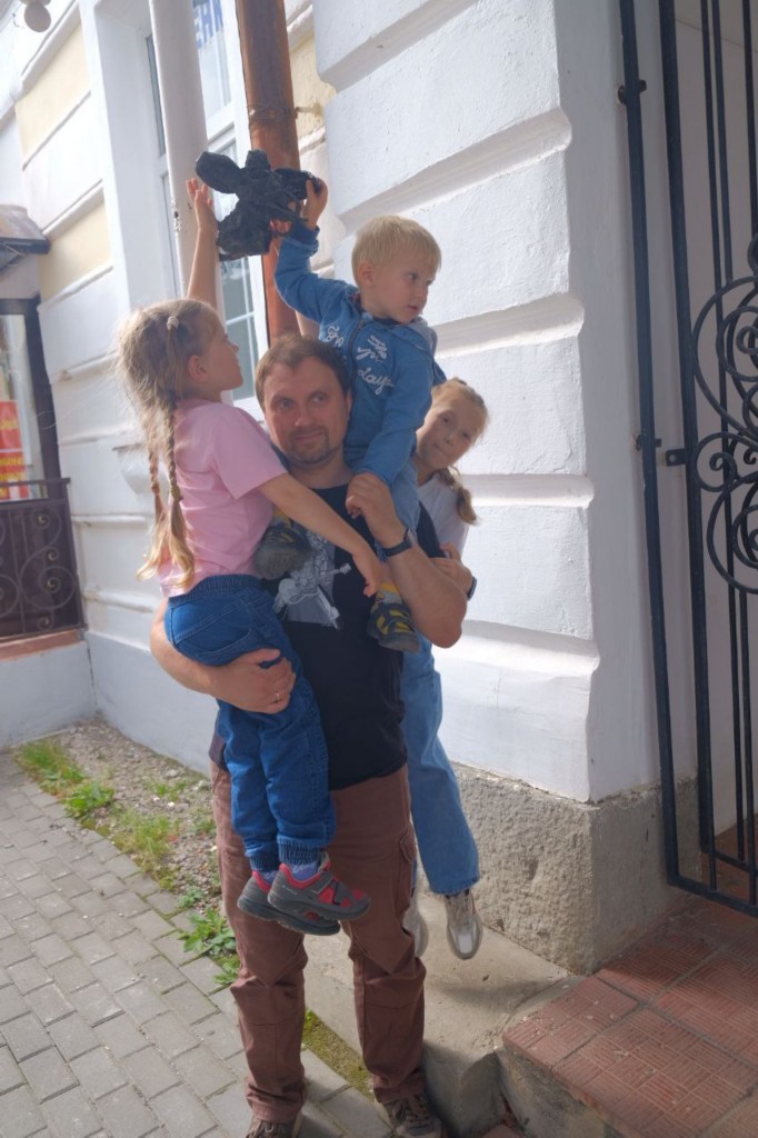 Этим летом мы с родителями путешествовали по России. По дороге из Великого Новгорода в Тверь мы заехали в Вышний Волочёк. В этом городе нас ожидало удивительное приключение – поиск волчков! Их в городе 14 и у каждого своя профессия: машинист, помещик, трактирщик, казначей, художник, футболист, торговец рыбой, лоцман, ямщик, почтальон, два артиста и даже два амура. Папа подготовил маршрут прогулки по городу. В определенных местах мы останавливались и искали волчков. Каждый волчок при помощи QR-кода «оживал» и рассказывал свою историю. Скульптуры волчков насыщенны интересными деталями, каждого можно долго рассматривать и знакомиться с историей города. Когда мы пришли к месту, где обитали волчки-амуры (у входа в ЗАГС), мы их не сразу заметили. Оказалось, они приделаны высоко на столбе. Мы закинули головы, встали на цыпочки, но все равно не могли их рассмотреть. И тут папа нас всех поднял! И меня, и Федю, и Надю!!! Мы смогли не только рассмотреть волчков, но даже подержать их за крылышки! Когда папа рядом, нет ничего невозможного!