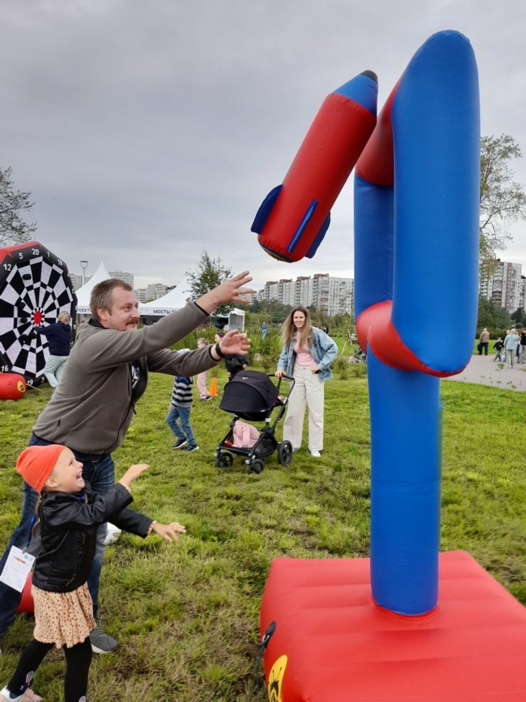 Всей семьей мы посетили «Большой семейный фестиваль» в парке «Парк Героев Пожарных». Там было очень весело и интересно. После посещения мастер-классов, мы пошли к главной площадке фестиваля на площади с памятником героям-пожарным. Неподалеку на газоне было много спортивных и развлекательных площадок. На фотографии мы с папой пытаемся направить ракету в цель. Это было очень весело и трудно, но нам удалось все же поразить ее, потому что мой папа самый сильный и меткий