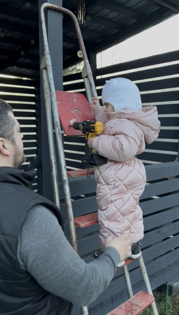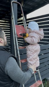 Виктория очень любознательная. Всегда подключается к любому процессу, будь то стройка, уборка, приготовление пищи и многое другое. На данном фото, папа снимал зимнее укрытие с беседки. Вика не заставила долго ждать, как сама залезла по лестнице и взяла шуруповерт. Конечно папа подстраховывал. Вместе они замечательно справились!