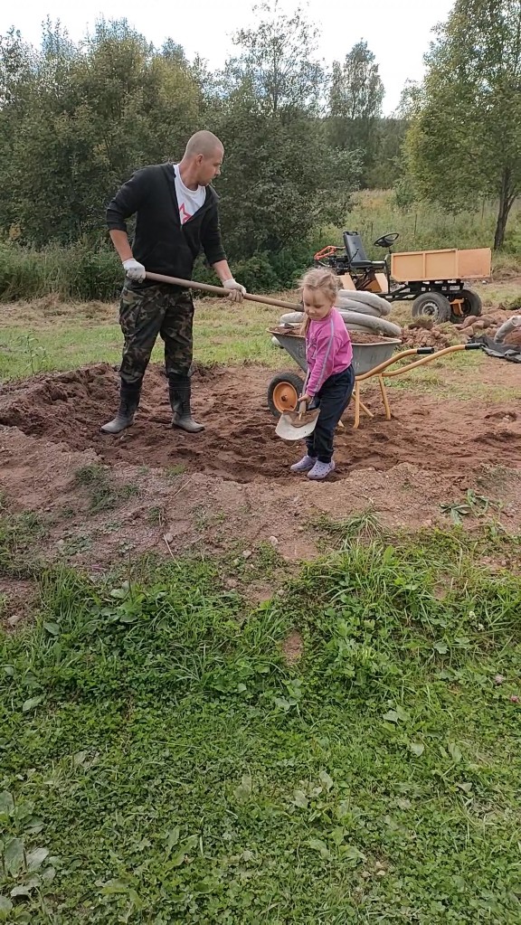 Ольга любит помогать папе только когда у нее "помогательное" настроение. На данном снимке Ольга отобрала лопату у сестры и изо всех сил старается набирать тачку песком, чтобы папа скорее отсыпал дорогу к дому.