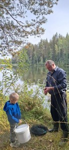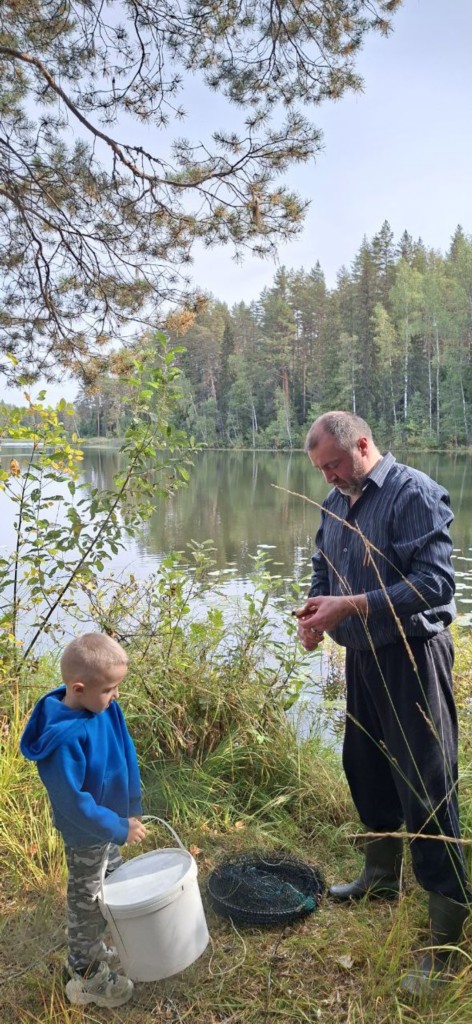 Папа передал свою любовь к рыбалке старшему и среднему сыну. Пришла очередь Владислава разделить его увлечения. У младшего сына есть все качества настоящего рыбака: терпение, ловкость и "горящие глаза"). Ловили на хлеб. Подготовку с выкапыванием червяков и насаживанием на крючок решили оставить на следующий год. Улов оказался достойным, пол ведра красноперок и ершиков. Бабушка приготовила наваристую уху и пожарила целую сковородку рыбки. Вот такие у нас добытчики ПАПА и ВЛАДИК)