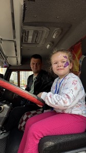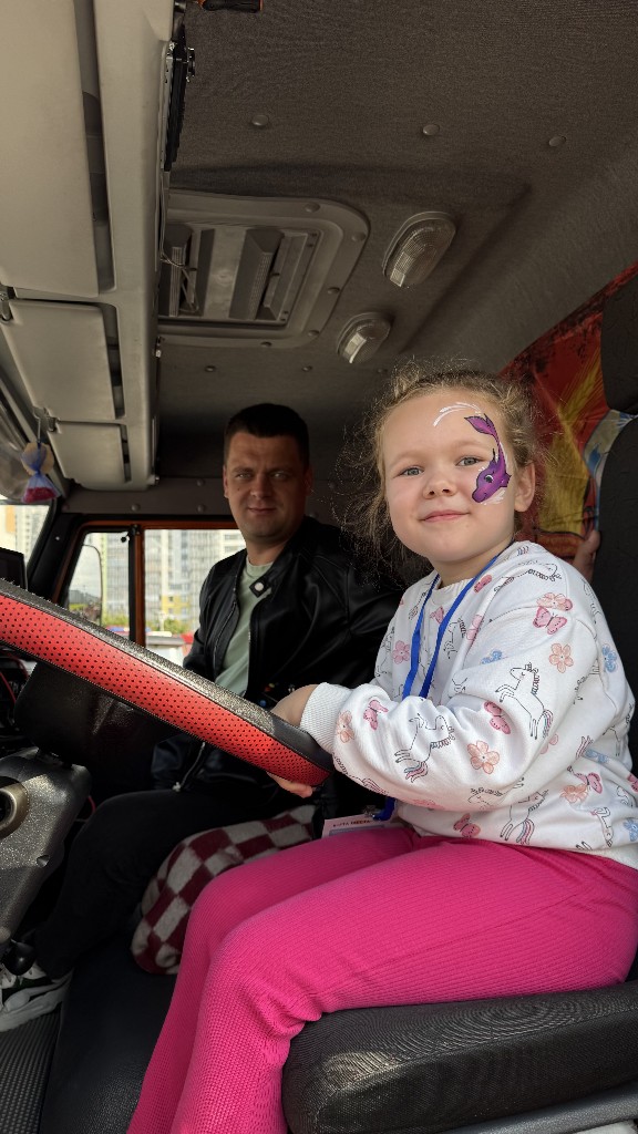 Мы с папой были на семейном фестивале! Я сидела за рулём огромного КАМАЗа — как настоящий водитель! Папа помог залезть в кабину и показывал, какие тут кнопки и рычаги. А ещё мы посмотрели пожарную машину, трактора и машину МЧС — всё такое большое и шумное! Было очень весело и интересно!