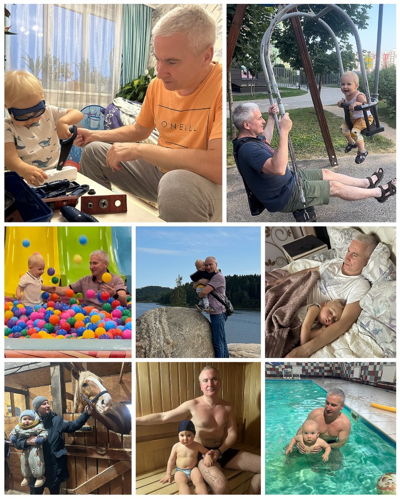 Меня зовут Тимур, а это мой папа Виталик. Наше с папой времяпрепровождение разнообразно. Мы путешествуем на природу, ходим в баню и бассейн как взрослые, гуляем на площадке, бегаем по лужам, катаем машинки на перегонки, подтягиваемся на шведской стенке, играем в футбол, боремся подушками и еще много всего интересного. Ой..чуть не забыл, еще мы любим вкусно поесть и хорошо поспать. Но больше всего мне нравиться учиться у папы чему-то новому и полезному. На одной из фотографий папа учит меня пользоваться строительными инструментами, закручивать винты отверткой, откручивать гайки, забивать гвозди молотком и распиливать пилой пенопласт. Мой папа мастер на все руки и он мне самый лучший друг. Я им восхищаюсь и очень его люблю.