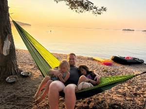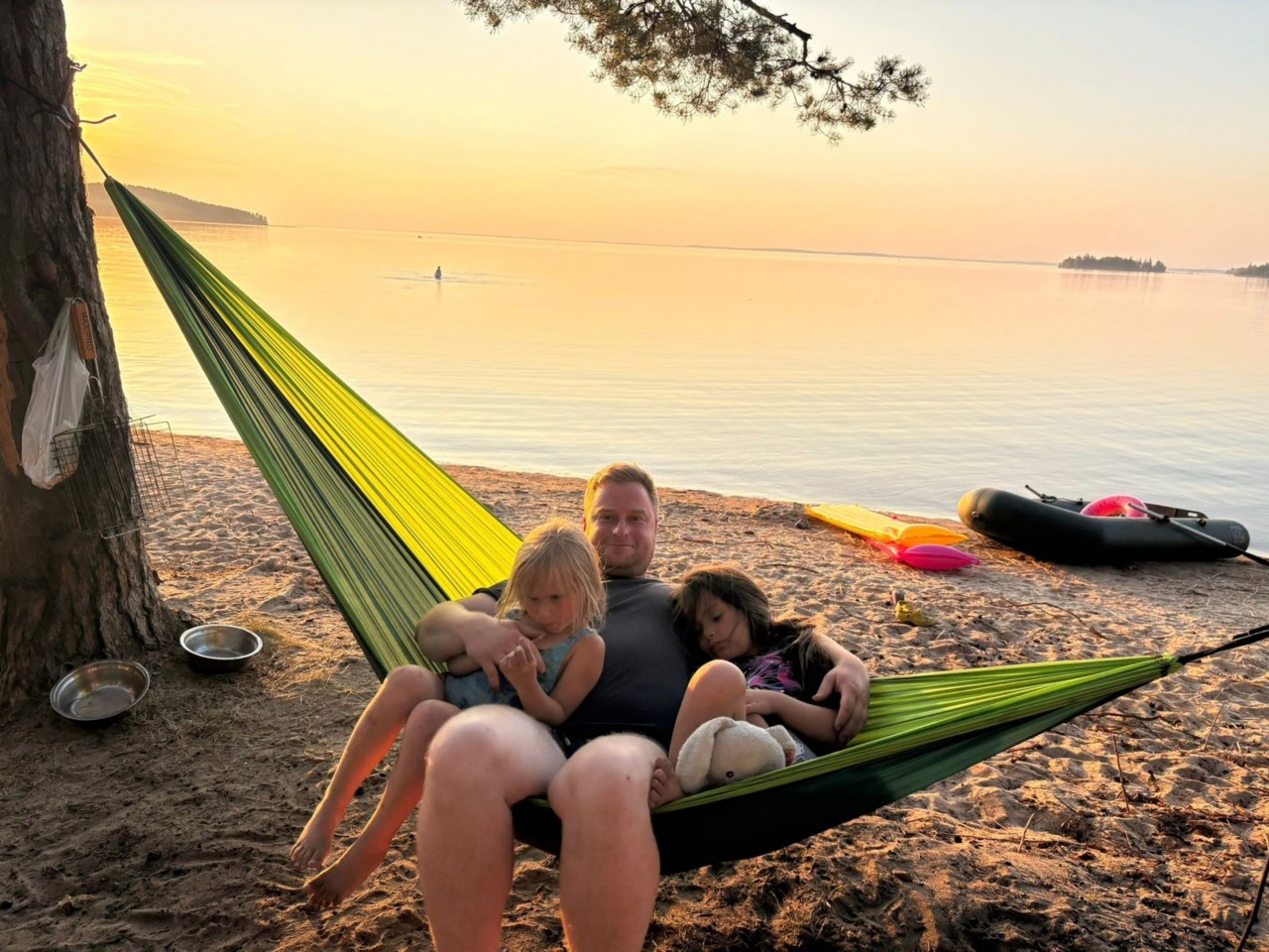 Летом папа повез всех нас в поход в Карелию. Мы жили в палатке, готовили еду на костре, купались и катались на лодке. Даже попали в шторм и очень испугались, но папа крепко держал нашу палатку и с ним нам было уже не страшно. Нам очень понравилось и в следующем году мы снова туда поедем!