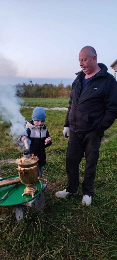Наша семья очень любит пить чай из самовара. На этих летних каникулах мы ездили специально в город Тулу, чтобы купить нам на дачу настоящий самовар, который нужно растапливать углями и маленькими дровами. В Туле мы посетили музей самоваров. Каких только самоваров там не увидели. Это было очень интересно!!! А потом выбрали для себя красивый и большой самовар, что бы хватило чая всей нашей большой семье. К нам на дачу часто приезжают бабушка, тётя и дядя. Растапливают самовар в нашей семье мужчины, то есть мы с папой. А мама с сестрой накрывают чайный стол – сушки, мед, печенье, конфетки. Что бы растопить самовар, мы с папой сначала разжигаем костер, угли из костра кидаем в специальную трубу в самоваре. Это делает папа. Потом я закидываю маленькие дровишки туда, несу папе воду для самовара, он заливает воду внутрь. Потом, когда появляется огонь, мы с папой надеваем другую длинную трубу на самовар, и ждем, когда закипит вода… А потом папа открывает крышку, и я забрасываю к дровам ещё шишки. Из-за них чай получается со вкусом леса, дерева и шишек. А за столом мне нравится больше всего открывать и закрывать краник у самовара, поэтому по кружкам чай всем разливаю я, а папа придерживает самовар, что бы я вдруг случайно не обжёгся.