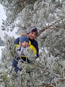На снимке запечатлены я - Кирилл и мой папа - Алексей на одной из наших семейных прогулок. Мы с папой любим баловаться, поэтому в тот день прогулка в парке закончилась игрой в снежки. Играли мы против команды мамы и брата. В последний момент мы замаскировались в заснеженном лесу и нанесли решающий ответ в снежной битве, после чего наша с папой команда одержала победу.