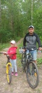 По выходным папа приезжает на дачу, где я провожу лето. Он научил меня кататься на двухколесном велосипеде, и всей семьёй мы с удовольствием совершаем велопрогулки. Однажды мы поехали в лес, там набрали черники и немного ароматной земляники. Было здорово, я всегда жду выходных с папой!