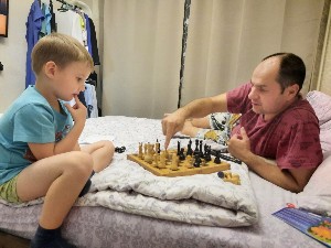 На широкой двуспальной кровати уютно расположились отец и сын. Оба уже переоделись в мягкую домашнюю одежду, готовясь ко сну после долгого дня. Перед ними стояла шахматная доска, покрытая чёрно-белым полем. Игроки внимательно смотрели друг на друга через доску, погружённые в размышления над следующим ходом. Их лица выражали сосредоточенность и серьёзность, словно сейчас решается нечто важное. Отец молча передвигал фигуры, иногда улыбаясь сыну, который напряжённо думал над каждым своим решением. Иногда звучала короткая реплика — подсказка или комментарий относительно ситуации на доске. Однако чаще всего царила тишина, нарушаемая лишь лёгким стуком деревянных фигур о клетчатое покрытие доски. Шахматная партия стала частью вечернего ритуала, своего рода мостиком между днём и ночью, наполненным теплом домашнего очага и взаимопониманием близких людей. Каждый ход был не просто игрой, а способом передать мудрость поколений, научить терпению и стратегии, развить умение принимать решения и отвечать за последствия своих действий. Так проходили часы, пока наконец одна сторона не объявляла победу, завершив партию и подарив обоим участникам ощущение удовлетворения от совместного дела. Затем фигуры аккуратно складывались обратно в коробку, свет выключался, и комната погружалась в ночь, оставив приятное чувство выполненного долга и единения семьи.