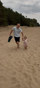 Фото сделано во время выезда семьей на пикник на берегу Финского залива. Лида за руку с папой бегут к мячу. Они любят вместе играть в футбол, и у Лиды уже довольно неплохо получается отдавать пас. Наше Петербургское лето очень короткое, нужно обязательно успевать активно проводить время на природе!