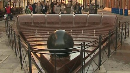 Один из самых необычных Санкт – Петербургских фонтанов. Струи воды под сильным давлением поддерживают на весу мраморный шар. На двенадцати гранитных ступенях располагаются бронзовые цифры, показывающие время суток. Каждый час изменяется направление струй, и вода падает на следующую ступень, тем самым показывая течение времени.